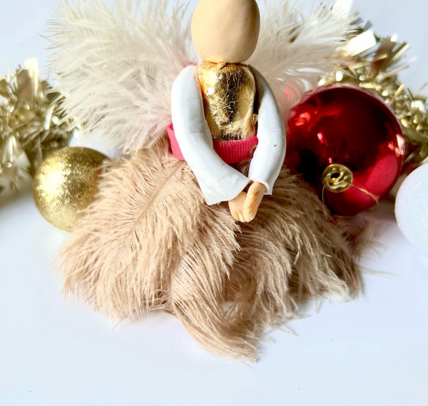 Christmas 2023Clay Christams Angel with Natural coloured Ostrich Feather Skirt and wings.